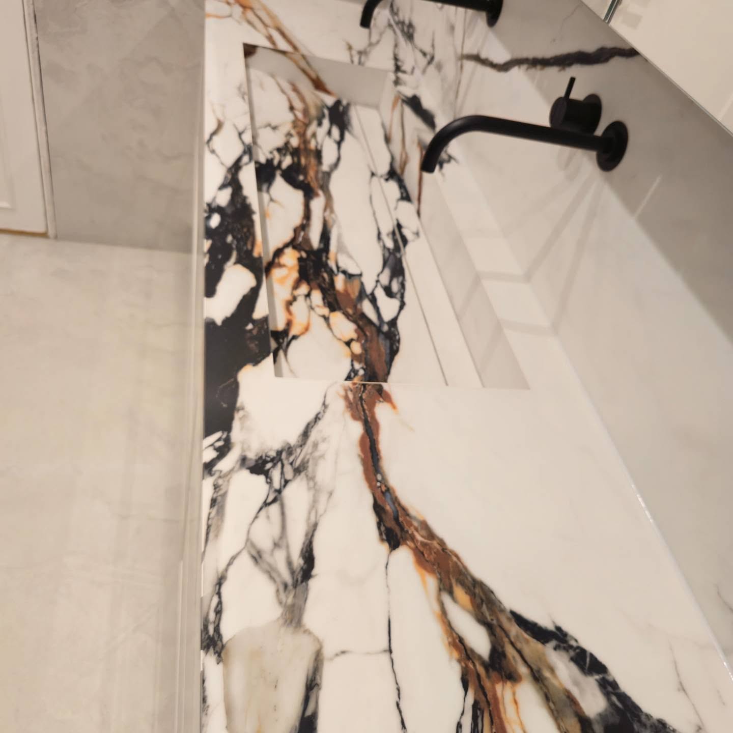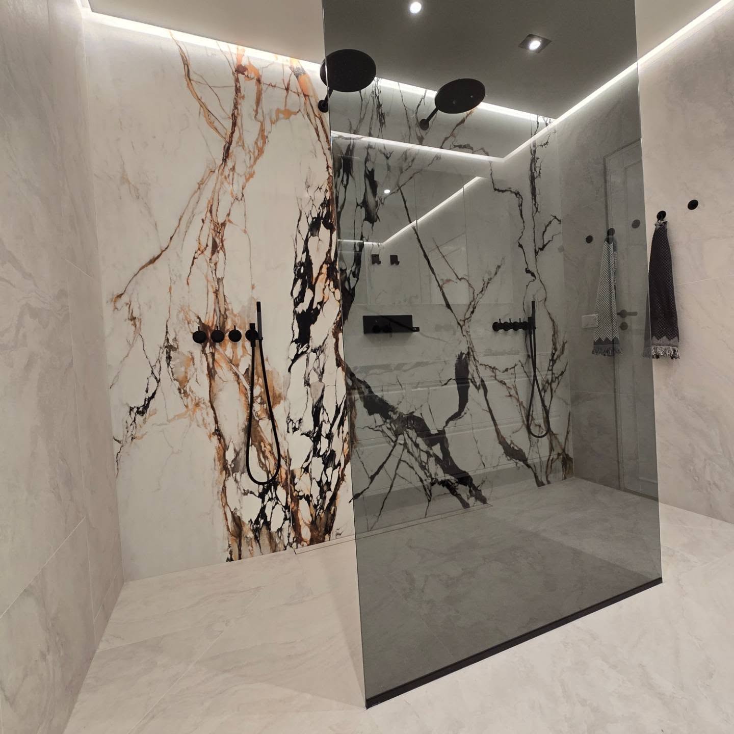 Sérstök áhersla var lögð á heildarmyndina í efnavali og uppsetningu. Flísar voru lagðar á gólf, veggi og innbyggð hólf þannig að rýmið verði samræmt og fágað. Mynstraðar flísar skapa sterkan fókus á völdum flötum á meðan ljósari flísar jafna heildina út og gefa rýminu bjarta og nútímalega ásýnd.