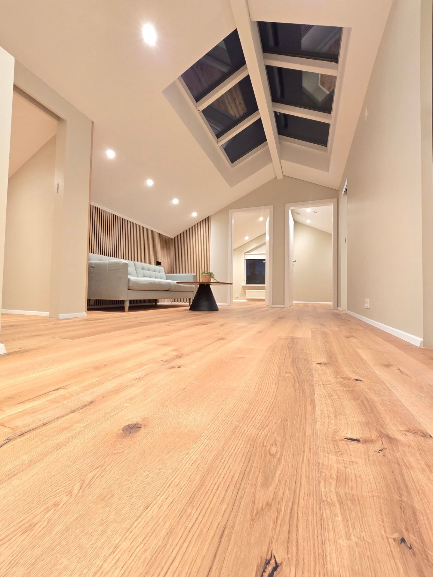 Sem hluti af framkvæmdinni var lagt nýtt parket og hljóðeinangrandi undirlag á alrými efri hæðarinnar. Parket gefur rýminu hlýlegt yfirbragð og skapar fallega samfellda heild í opnu rými eins og þessu. Vönduð parketlagning tryggir einnig að gólfið endist vel og haldi útliti sínu til lengri tíma.