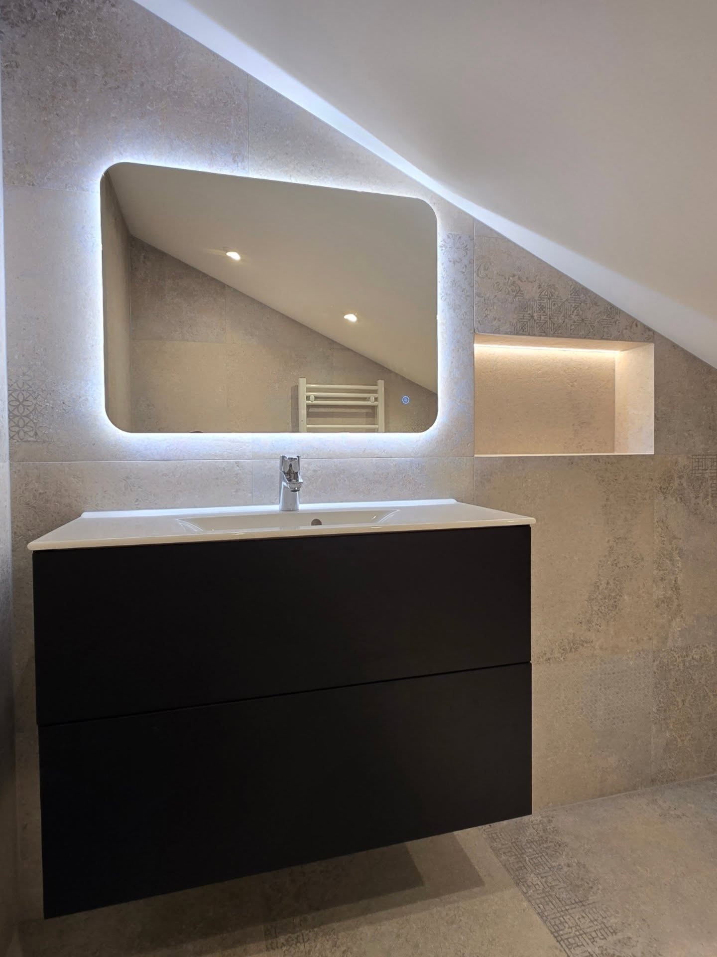 Heildarendurnýjun á baðherbergi með nýju skipulagi, nýjum tækjum og samræmdum frágangi sem býr til nýtt heildrænt rými með fáguðu og sterku útliti.