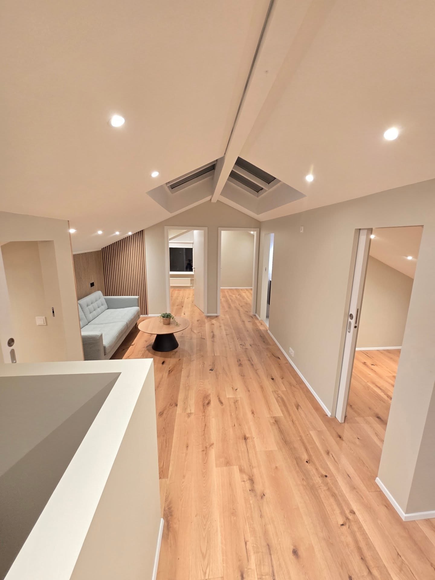 Efri hæðin var einnig máluð til að skapa bjart og hreint útlit sem passar vel við nýja parketgólfið og nútímalega hönnun rýmisins. Vönduð málningarvinna skiptir miklu máli fyrir heildarútlit heimilisins og getur gjörbreytt tilfinningunni í rýminu.