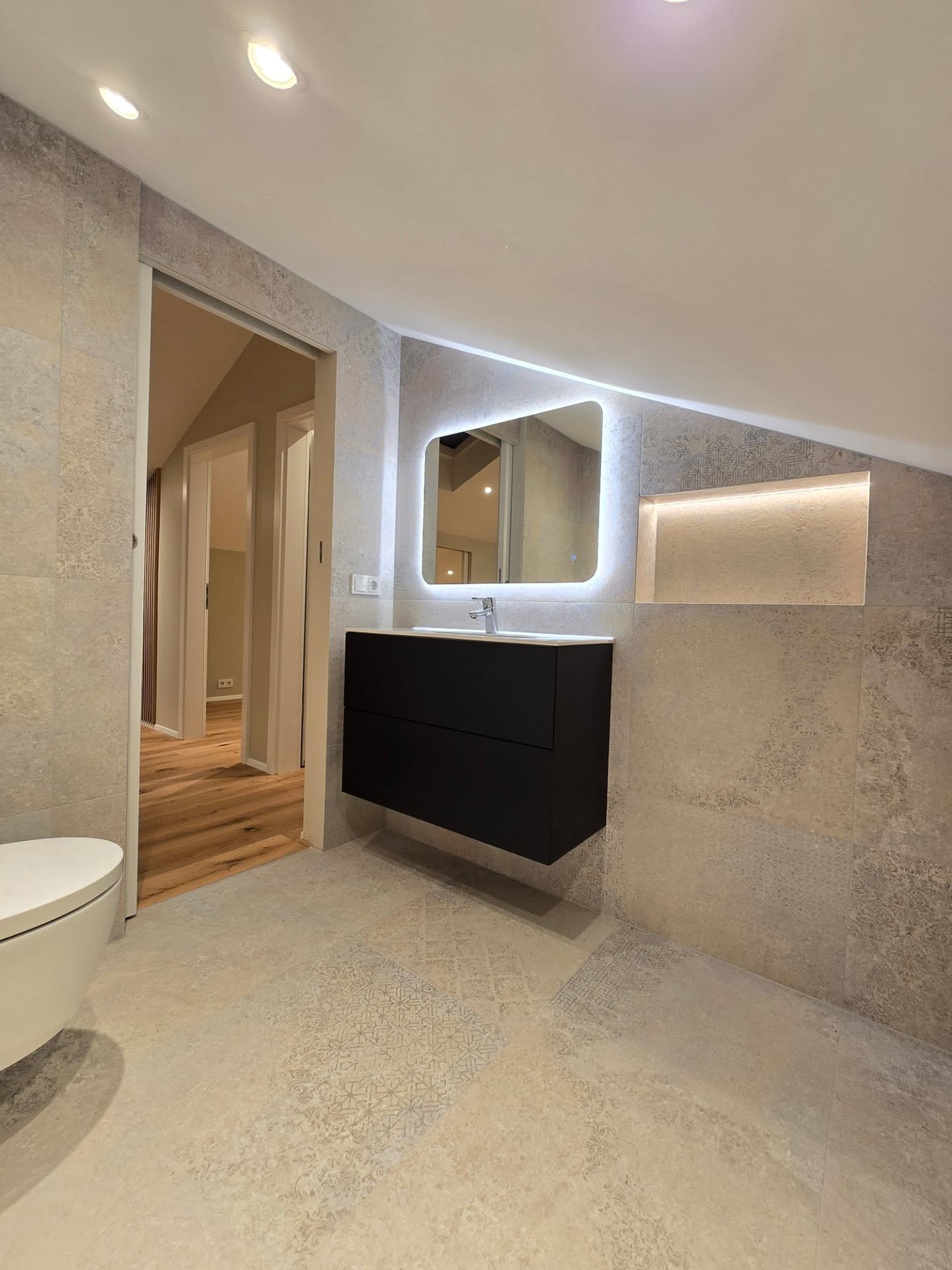 Stórar flísar voru lagðar á gólf og veggi ásamt flísalögn í innbyggð hólf. Slíkur frágangur skapar sterkt útlit og samfellda ásýnd.